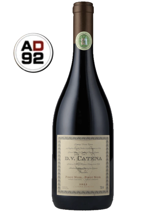 O DV Catena Pinot Noir é envelhecido por 12 meses em barricas de carvalho, sendo 85% carvalho francês e 15% carvalho americano. Leva uvas de dois vinhedos, o Domingo e Adrianna, ambos plantados em 1992, no terroir mágico de Gualtallary, a 1300 metros de altitude, onde o clima é fresco. O solo pedregoso e de calcário confere elegância e mineralidade ao vinho.
